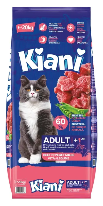 מזון מלא לחתולים בוגרים Kiani בקר וירקות 20 ק"ג מזון יבש מלא לחתולים בוגרים מגיל שנה ומעלה, עם בשר בקר וירקות, חלבון ממקור חי, ויטמינים ומינרלים לתמיכה בעור ופרווה, מערכת עיכול, לב ומערכת חיסון בריאה. שק חסכוני 20 ק"ג. מזון יבש מלא לחתולים בוגרים Kiani בקר וירקות פותחים במיוחד לצרכים התזונתיים של חתולים מגיל שנה ומעלה. הפורמולה משלבת בשר בקר, ירקות נבחרות, ויטמינים, מינרלים וטאורין, כדי לספק תזונה מאוזנת ליום יום ולתמוך בבריאות כללית לאורך זמן.
