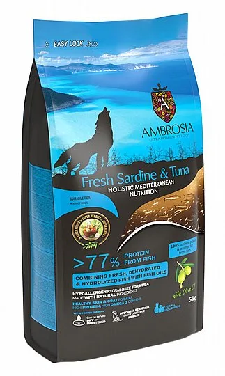 אמברוסיה סרדין וטונה לכלבים בוגרים מגזע קטן ששוקלים עד 10 ק"ג ללא דגנים 5 ק"ג. מזון אולטרה פרימיום לכלבים על בסיס דגים ללא דגנים, תירס וחיטה, מה שהופך אותו למזון היפואלרגני.